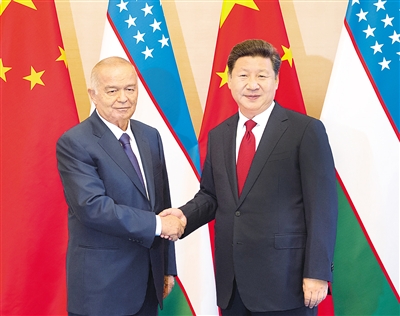 习近平欢迎卡里莫夫来华出席中国人民抗日战争暨世界反法西斯战争胜利70周年纪念活动,感谢乌兹别克斯坦人民对中国抗战给予的宝贵支持。习近平指出,当前,中乌关系发展势头良好,各领域合作全面推进,给两国人民带来实实在在的利益,也为本地区发展和稳定作出积极贡献。中方坚持推动两国战略伙伴关系发展,赞赏乌方对丝绸之路经济带建设的积极支持,愿积极加强双方交通基础设施建设合作,扩大贸易和投资规模。双方要深化安全合作。中乌双方在上海合作组织框架内一直保持高水平战略协作,中方愿全力支持和配合乌方作为主席国做好上合组织各项工作。