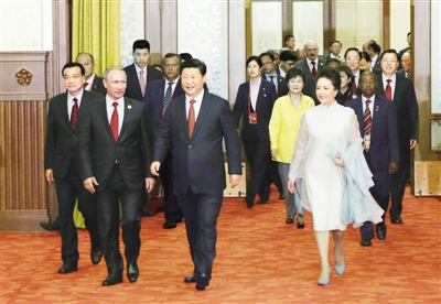 在喜庆欢乐的乐曲声中,习近平同中外领导人共同举杯,同庆中国人民抗日战争暨世界反法西斯战争胜利70周年,共同祝愿世界和平。