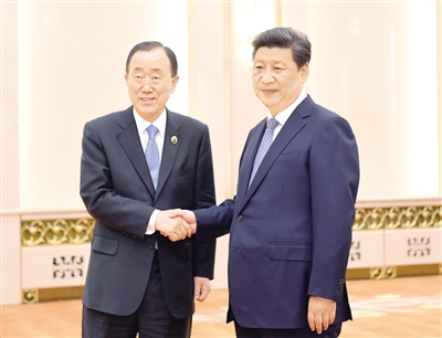 习近平欢迎潘基文来华出席中国人民抗日战争暨世界反法西斯战争胜利70周年纪念活动,强调中国举行这次纪念活动,就是要宣示中国人民维护和平的决心。我上午宣布中国将裁军30万,就是中国维护和平承诺的重要体现。习近平指出,联合国诞生于世界反法西斯战争的硝烟中,是第二次世界大战胜利的最重要成果之一。中国当时是第一个在《联合国宪章》上签字的国家。作为安理会常任理事国,中国愿同联合国一道,以纪念联合国70华诞为契机,维护好第二次世界大战胜利成果及以《联合国宪章》为基础的国际秩序;坚持多边主义,加强联合国作用;平衡推进联合国在和平与发展两大领域工作,特别是增强和平行动能力,落实好2015年后发展议程。中方支持联合国在气候变化领域发挥重要作用。
