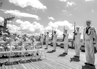 ① 9月2日,美国海军士兵在夏威夷珍珠港纪念二战胜利70周年活动上朝天鸣枪表示敬意。