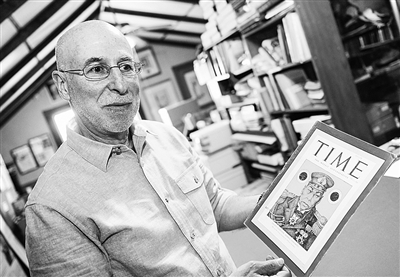 ② “亚瑟·希克社团”主席欧文·昂加尔展示珍珠港事件后出版的《时代周刊》杂志印有希克创作的山本五十六肖像,题为“来自日本的侵略者”。 新华社记者 张超群摄