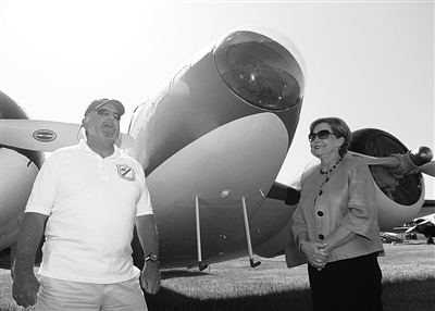 ③ 在美国路易斯安那州门罗市,陈纳德航空军事博物馆馆长、陈纳德的外孙女尼尔·凯乐威(右)接受新华社专访时介绍飞虎队使用的B-25轰炸机。 新华社发