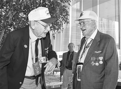 ④ 9月1日,92岁的美国“飞虎队”老兵勒罗伊·帕拉莫(右)和93岁的美国“飞虎队”老兵大卫·海沃德在酒店交谈。 新华社发