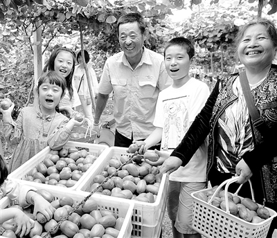 9月6日,山东省淄博市博山区源泉镇猕猴桃采摘园的猕猴桃进入成熟期,不少游客前来采摘游玩。近年来,该镇猕猴桃种植已发展到8000亩,每年产量达700万斤,户均增收2.8万元,吸引游客80多万人次。本报记者 李树贵摄