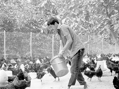 阿依玛克村村民艾力努尔巴克正按中科院新疆分院驻村工作组技术指导,利用核桃林下空地喂养黑鸡。本报记者 佘惠敏摄