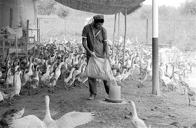 墨玉县巴西恰瓦格村,中科院援建的盐沼地养殖示范基地里,承包户库尔班·肉孜买买提正在喂鹅。本报记者 佘惠敏摄