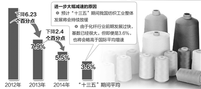 进一步减速,一是预计“十三五”期间我国纺织工业整体发展将会持续放缓;二是由于化纤行业前期发展过快,基数已经很大。“增速的降低是在原来远高于国际增速的基础上进行的调整。即便是3.6%,也将会略高于国际平均增速。”端小平说。