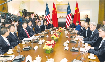 习近平指出,中美关系是世界上最重要的双边关系之一。建交36年来,中美关系历经风雨,但始终向前,得到历史性发展。2013年6月我同奥巴马总统在安纳伯格庄园会晤,就共同努力构建中美新型大国关系达成共识。两年多来,中美关系不断取得新进展,给两国人民和世界人民带来许多福祉。中方愿同美方一道,坚持不冲突不对抗、相互尊重、合作共赢,不断拓展双边、地区、全球层面务实合作,以建设性方式管控分歧和敏感问题,推动中美关系始终沿着正确轨道向前发展。