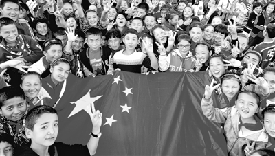 10月1日,新疆克拉玛依市白碱滩区沁园社区中小学生在沁园社区广场舞动国旗喜迎国庆佳节。 周建玲摄
