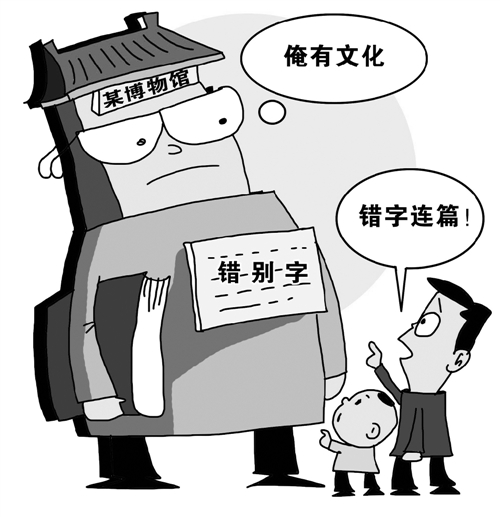 “指定”写成“制定”、“车辆”成了“车俩”……仅有86个汉字的小小指示牌上出现了4个错字。不仅中文错了,标点和英文翻译也不对。这事发生在作为宁波城市文化核心与窗口的宁波博物馆内。其实,文化窗口犯如此“低级错误”已经不是第一次了,之前不少地区的旅游景点都出现过类似的问题。只是,“低级错误”屡说屡犯,恐怕与文化程度没多大关系,而是集体性不负责、不严谨所致。具体办事者“随便写写”,完成后不校对;相关领导或者根本不看,或者只是“随便看看”,没有把关意识;其他工作人员视而不见,任由“错别字指示牌”立于公众眼皮底下。细节体现真实的管理水平、体现真实的工作作风,希望这些“细节”上的问题被早日纠正为好。 (时 锋)