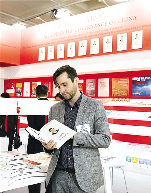 图为一名英国读者翻阅《习近平谈治国理政》(繁体中文版)一书。