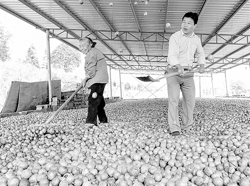 10月20日,贵州省天柱县白市镇三间桥村油茶科普示范林基地社员在晾晒油茶果。据介绍,该县是全国油茶发展重点县,有油茶林面积29.3万亩,种植户4万多户,今年油茶产值将破亿元。 龙胜洲摄