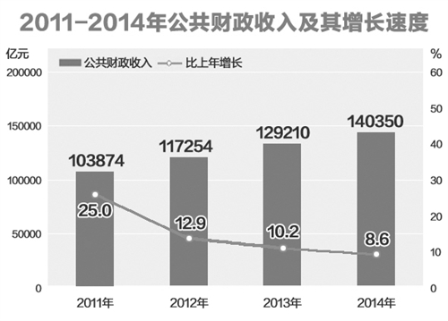 国家财政实力明显增强。2011年,我国公共财政收入突破10万亿元大关,2014年超过14万亿元,比2010年增长68.9%,年均增长14.0%。随着国家财政实力增强,财政对经济社会发展的支持不断加大。2014年,我国公共财政支出超过15万亿元,比2010年增长68.7%。重点领域民生支出得到较好保障。2011年-2014年,城乡社区事务、医疗卫生、交通运输、教育、社会保障和就业支出年均分别增长21.1%、20.4%、17.2%、16.2%和14.9%。