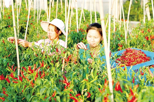 图为日前江西峡江县分界村的贫困户在采摘辣椒。今年以来,该县派出千名党员干部组成100个“连心”小分队,实施以绿色蔬菜、精品果业为主的产业扶贫,助力群众脱贫解困。陈福平摄
