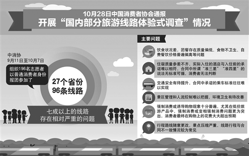 9月11日至10月7日,中国消费者协会组织开展了对部分国内旅游线路体验式调查。来自全国24个副省级以上消协组织的196名志愿者担任体验员,经过培训后以普通消费者身份报团参加了覆盖国内27个省份的96条线路(包括“十一”黄金周期间线路34条),并对85家旅行社服务进行体验式调查。