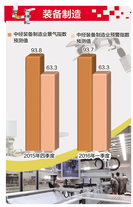 经模型测算,预计2015年四季度和2016年一季度中经装备制造业景气指数分别为93.8和93.7,中经装备制造业预警指数均为63.3。