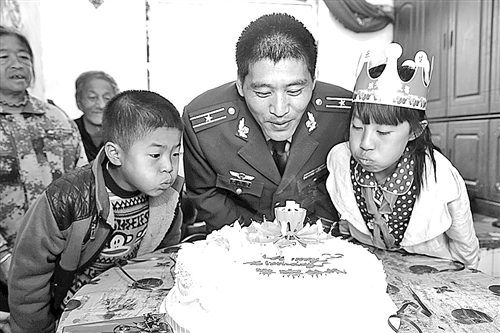 吉林公安边防总队白山支队六道沟边防派出所宝山警务室民警宁忠伟,在平均海拔860米的偏远小山村一干就是10年,尽心尽力为村民服务。图为宁忠伟给村里留守儿童过生日。 赵建龙摄