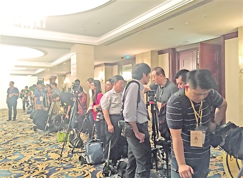 左图 记者早早地在会议厅外排队等候入场。本报特派记者 廉丹 摄