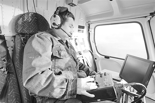 近几年来,国家电网公司大力推行直升机电力作业,过去4年中,已使用直升机实施巡线34.8万公里,发现各类缺陷55074处,其中严重缺陷2122处,有力保障了电网安全稳定运行。图为工作人员正在飞机上操作红外仪器。