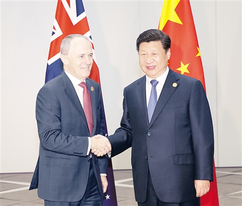 习近平指出,中澳同处亚太地区,两国拥有重要共同利益和广阔合作空间。我们愿同澳方在互信互利基础上,深化各领域友好交流和务实合作,推动中澳全面战略伙伴关系健康稳定向前发展。双方要密切高层交往,加强沟通、增进互信。双方要发挥互补优势,提高务实合作水平,推动中澳自贸协定尽快生效,推进“一带一路”倡议同澳方“北部大开发”计划对接。我们鼓励中国企业参与澳大利亚北部地区铁路、公路、水利等项目建设,希望澳方为中国企业提供公平投资环境。中澳要开展好防务合作,共同打击腐败犯罪,增进教育、地方、旅游合作。中方愿同澳方加强在联合国、二十国集团、亚太经合组织等多边机制的沟通和协调。