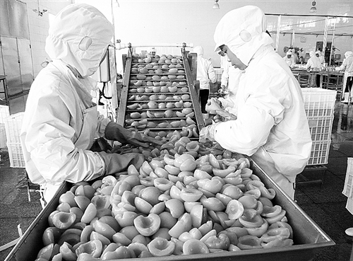 11月19日,江苏东海县韩资果品深加工企业农民工正在加工出口黄桃。据介绍,2015年该县韩资果品深加工企业已加工出口果品等近50万吨,销往60多个国家和地区。 张正友摄