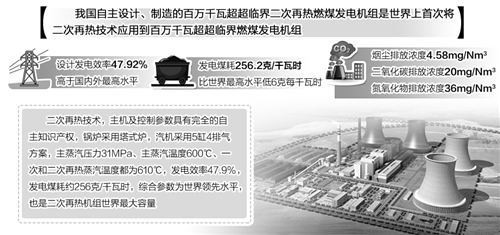 该工程集中展现了我国多年来燃煤技术发展水平,成功打造了更高效的清洁燃烧火电机组。设计发电效率47.92%,高于当今国内外最高水平;发电煤耗256.2克/千瓦时,比当今世界最高水平低6克/千瓦时;烟尘、二氧化碳和氮氧化物排放浓度分别为4.58mg/Nm3、20mg/Nm3、36mg/Nm3,实现超低排放,代表了世界领先发电技术。