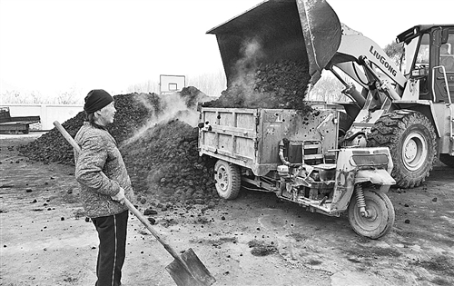 11月17日,山西太原小店区西温庄乡高中村村民准备往自家运输“绿色焦炭”。近日,太原首次在燃煤取暖集中的330多个城中村、棚户区和分散锅炉推广“绿色焦炭”,惠及居民超过15万户。 徐 伟摄(新华社发)