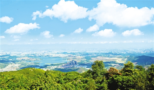 上图 这是从东莞大岭山森林公园茶山顶上俯瞰东莞厚街镇(资料照片)。深秋岭南,气候渐凉。在东莞大岭山森林公园,放眼是满目高低起伏的青翠,山间溪水清冽,登山的年轻男女缓步而过,草地上有老人正在躺椅上闭目养神。很难想象,这个场景会出现在闻名全球的“世界工厂”东莞。