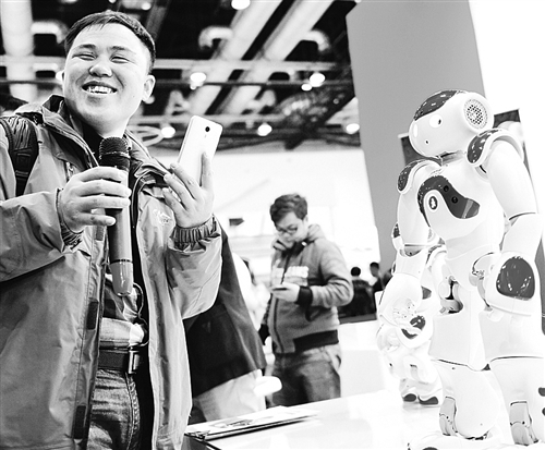 11月24日,2015世界机器人博览会机器人互动体验区内,观众在与机器人进行语音互动。
