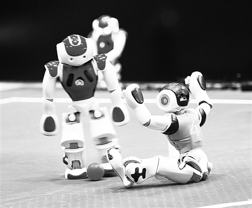 11月24日,2015世界机器人博览会上,机器人足球表演赛正在进行。