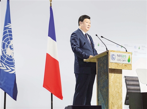 习近平强调,中国一直是全球应对气候变化事业的积极参与者,目前已成为世界节能和利用新能源、可再生能源第一大国。中国将落实创新、协调、绿色、开放、共享的发展理念,形成人与自然和谐发展现代化建设新格局。中国在“国家自主贡献”中提出的目标虽然需要付出艰苦努力,但我们有信心和决心实现我们的承诺。中国政府认真落实气候变化领域南南合作政策承诺,今年9月宣布设立中国气候变化南南合作基金,将于明年继续推进清洁能源、防灾减灾、生态保护、气候适应型农业、低碳智慧型城市建设等国际合作,并帮助发展中国家提高融资能力。