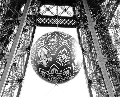 在巴黎市埃菲尔铁塔上,悬挂着由美国艺术家设计的巨幅作品“地球危机”,旨在唤起人们关注地球气候变暖带来的危害。 本报特派记者 胡博峰摄