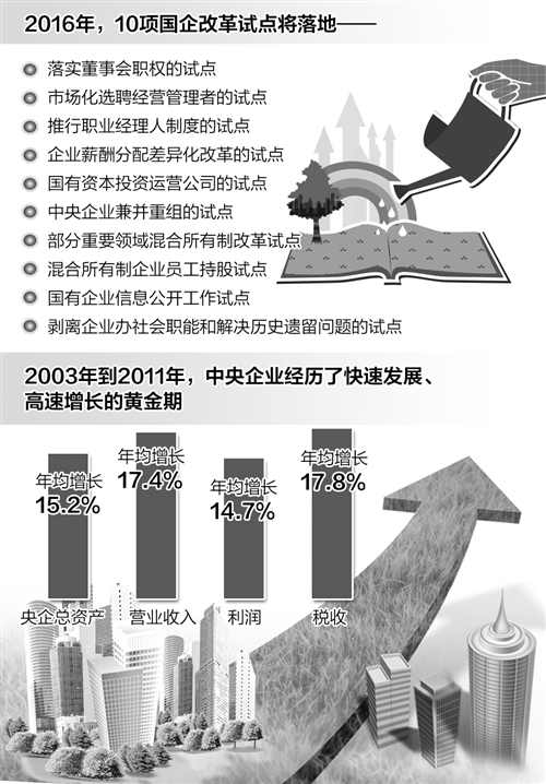 国企改革,试点探路。吹风会上,国资委副秘书长彭华岗介绍说,明年有10项国企改革试点将全面展开。这10项改革试点是国务院国有企业改革领导小组办公室针对社会关注的热点、难点问题确定的。具体内容是:一是落实董事会职权的试点,有关文件专门讲要落实董事会重大决策,选人用人和分配权利,而且特别提出法无授权,任何政府部门和机构都不得干预,这项工作通过试点逐步推进。二是市场化选聘经营管理者的试点。三是推行职业经理人制度的试点。四是企业薪酬分配差异化改革的试点。五是国有资本投资运营公司的试点。六是中央企业兼并重组的试点。七是部分重要领域混合所有制改革试点。八是混合所有制企业员工持股试点。九是国有企业信息公开工作试点。十是剥离企业办社会职能和解决历史遗留问题的试点。2016年全国全面推开供水、供电、供热和物业管理分离移交,启动剥离医院、教育等公共服务机构试点。