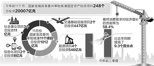 今年前11个月,国家发展改革委共审批核准固定资产投资项目248个,总投资20007亿元。11月份当月,国家发展改革委共审批核准11个项目,总投资1012亿元。其中,交通基础设施项目2个,总投资447亿元;能源项目4个,总投资546亿元;信息化项目2个,总投资8亿元;社会事业项目3个,总投资11亿元。