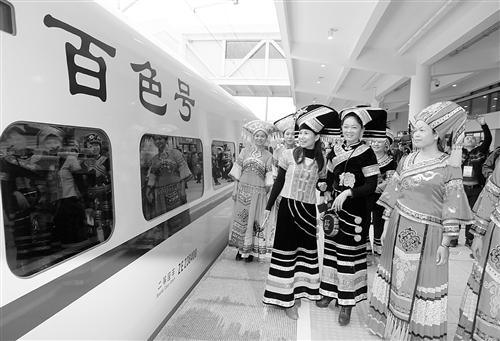 “毕竟是第一次从我家门口乘坐高铁,真是太有纪念意义了。”在动车上,一位名字叫陶嘉欣的高铁迷激动地告诉记者,她一大早就赶到百色车站,要用相机记录下这令人难忘的时刻。