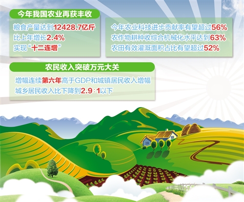 石俊强的丰产丰收绝非个案。数据显示,今年我国农业再获丰收,粮食产量达到12428.7亿斤,比上年增长2.4%,实现“十二连增”;棉油糖、肉蛋奶、果菜茶、水产品等重要农产品丰产丰收,供应充足。农民收入突破万元大关,增幅连续第六年高于GDP和城镇居民收入增幅,城乡居民收入比下降到2.9∶1以下。