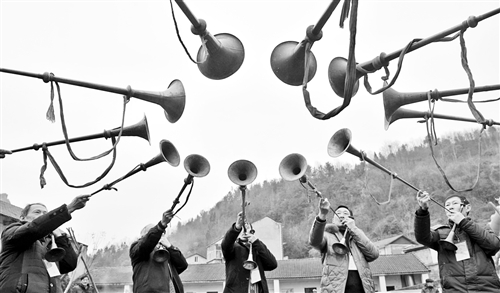 12月19日,非遗传承艺人在湖北秭归县杨林桥镇响水洞村为游客表演杨林堂鼓。“杨林堂鼓”是生活在巴楚交界深山中民间艺人的“音乐食粮”,2014年被列入湖北省非物质文化遗产名录。目前,当地政府制定了杨林堂鼓抢救保护计划,成立了“杨林堂鼓”抢救保护工作专班和艺术协会,划定了保护区域,设立了抢救保护专项资金,使其得以传承发扬。王辉富摄