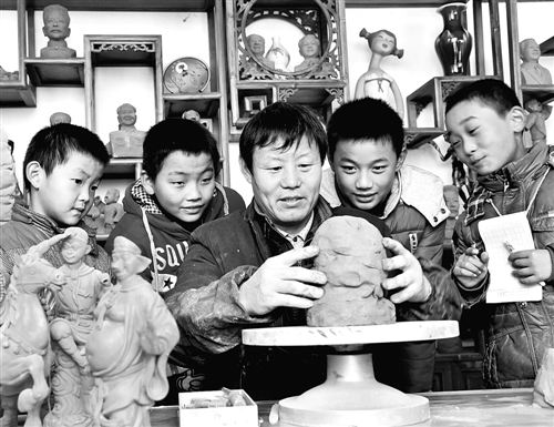 12月24日,学生们在山东枣庄市山亭区农民“乡村英才”刘进潮(右三)的家里学习泥塑制作。