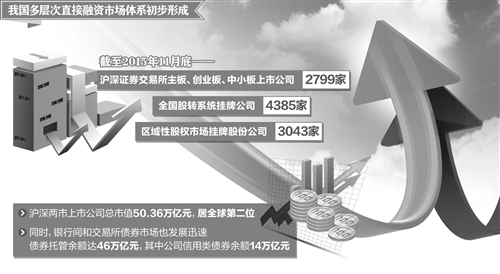 近年来,我国直接融资取得长足发展,直接融资比重稳步提升,直接融资服务经济社会发展的能力不断提升,直接融资市场化机制不断完善。中国证监会提供的材料显示,目前,我国多层次直接融资市场体系初步形成。截至2015年11月底,沪深证券交易所主板、创业板、中小板上市公司共2799家,全国股转系统挂牌公司4385家,区域性股权市场挂牌股份公司3043家。11月底,沪深两市上市公司总市值50.36万亿元,居全球第二位。同时,银行间和交易所债券市场也发展迅速,截至2015年11月底合计债券托管余额达46万亿元,其中公司信用类债券余额14万亿元。