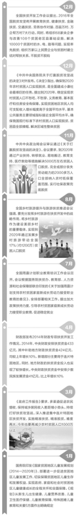 2015年,国家发展改革委等部门印发了《“十三五”时期易地扶贫搬迁工作方案》。财政部落实大幅增加中央财政扶贫投入力度要求,对扶贫资金监管和资金整合力度做出新的安排。国土资源部将出台措施专项安排贫困县和老区县用地计划指标,允许将贫困县和老区县增减挂钩节余指标在省域内使用。水利部着力解决贫困人口饮水安全问题,“十二五”期间水利投入用于贫困地区占30%。交通运输部进一步提高贫困地区农村公路建设补助标准。人民银行召开金融扶贫电视电话会议,全面安排金融扶贫工作,设立专项扶贫基金。农发行成立扶贫开发事业部,已发放易地扶贫搬迁政策性贷款804亿元,总政治部、工业和信息化部、住房和城乡建设部、民政部、农业部、教育部、人力资源和社会保障部、银监会等部门抓紧编制行业扶贫规划,陆续出台支持脱贫攻坚的政策。