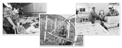 左图 河北省万全县以“入股+代养肉猪”的扶贫模式,引导农民入股,统一提供仔猪、饲料和防疫等技术指导,贫困家庭每年户均可增加收入3600元。邢鹏飞摄