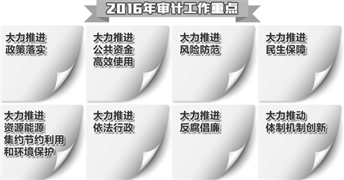 在12月28日召开的全国审计工作会议上,审计署审计长刘家义表示:“2016年要加大改革创新力度,进一步完善审计制度,依法全面履行审计监督职责,将推动中央重大决策部署贯彻落实作为重中之重,严肃揭露和查处重大违纪违法问题,及时反映重大风险隐患,注重揭示制约发展的深层次问题,充分发挥审计在国家治理中的基石和重要保障作用。”