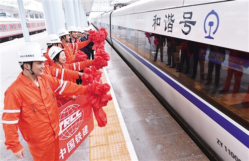 图为12月30日,中国铁建的西环铁建设者们在海口站送别开往三亚的动车。 新华社记者 赵颖全摄