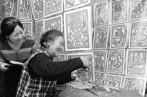 右图 2015年12月31日,辽宁锦州市凌河区康宁街道新制社区77岁退休老教师蒋励勉在展示剪纸作品。她历时百天创作百幅“福”字剪纸作品,这些福字造型各异、内容丰富,具有浓郁的地方民俗风格。
