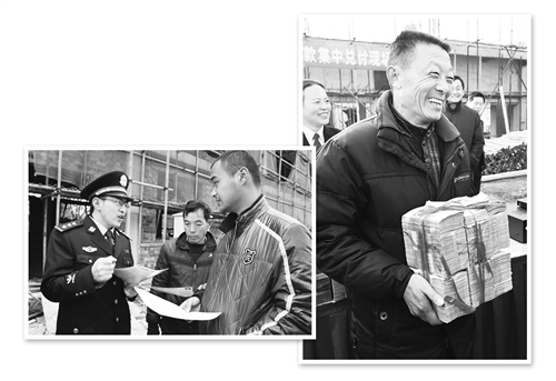 右图 2015年12月30日,河南省洛阳市两级人民法院举行“拖欠农民工工资案件集中办理”集中兑现活动,向50余位农民工发放执行款500余万元。图为农民工代表领取欠薪执行款。新华社记者 李 博摄