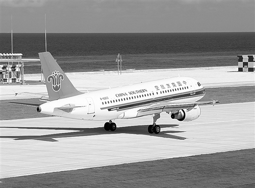 1月6日10时21分,南方航空的飞机降落南沙永暑礁新建机场。当日,中国政府征用的两架民航客机先后从海口美兰机场起飞,经过近2小时的飞行于10时21分、10时46分平稳降落南沙永暑礁新建机场并于当日下午返回海口,试飞成功。永暑礁新建机场位于我国南沙永暑礁上,是我国目前最南端的一座机场。新华社记者 査春明摄