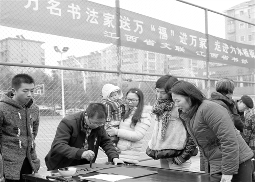 1月9日,由江西省文联、江西省书协主办,抚州市文联、抚州市书协等协办的“万名书法家送万‘福’进万家”活动在六水桥小游园举行,现场书法家们挥毫泼墨,写福字、送春联,把最美好的祝福奉献给市民。 陈强摄