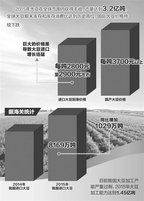 分析人士认为,造成当前大豆价格持续下跌的主要原因是全球供应非常宽裕。据了解,2015年大豆在全球范围内获得丰收,产量达到3.2亿吨,全球大豆的期末库存和库存消费比达到历史高位,国际大豆价格持续下跌。在国内,失去临储支撑的国产大豆价格随国际市场下跌。不过,国产大豆价格仍然处于全球市场的“高地”,目前进口大豆到港价格为每吨2800元至2900元左右,而国产大豆为3700元以上。巨大的价格差导致大豆进口增长迅猛。据海关统计,2015年我国进口大豆8169万吨,比上一年的7140万吨增加1029万吨。