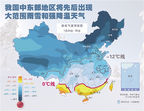 伴随着雨雪而来的是中东部地区自北向南波及的“寒风刺骨”。张涛表示:“1月21日起,冷空气将首先影响内蒙古中西部、西北地区东北部等地,气温将先后下降6℃至8℃;22日至24日,冷空气将加速南下,江浙一带最低气温可能跌破-10℃,最低气温可能逼近历史同期极值。不过,南北方气温都将在25日之后出现明显回升。”