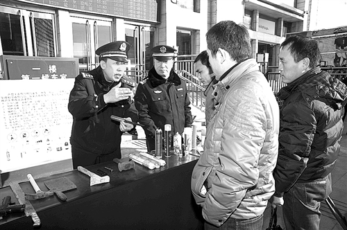 为备战春运,全国铁路公安机关进一步加强安检查危工作,强化安检人员教育培训,严格安检设备检修,完善工作勤务制度,加大易燃易爆危险品检查力度,切实保障旅客出行安全。图为民警在山西大同火车站广场向旅客宣传安检有关规定。 梁西征摄